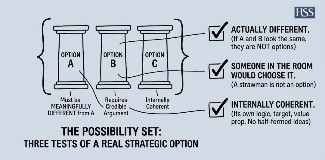 That is the Possibility Set. And skipping it is why so many strategies feel like the only thing anyone could have done, right up until they stop working.