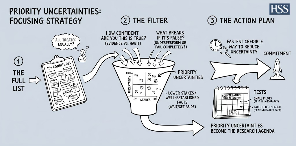 The conditions on a WWHTBT list aren’t equivalent. Some are well-established facts that don’t need investigation. Some are uncertain but won’t hurt the strategy much even if they’re wrong. And a few are both uncertain and load-bearing. Those are your priority uncertainties. They’re where the work needs to go before you commit.